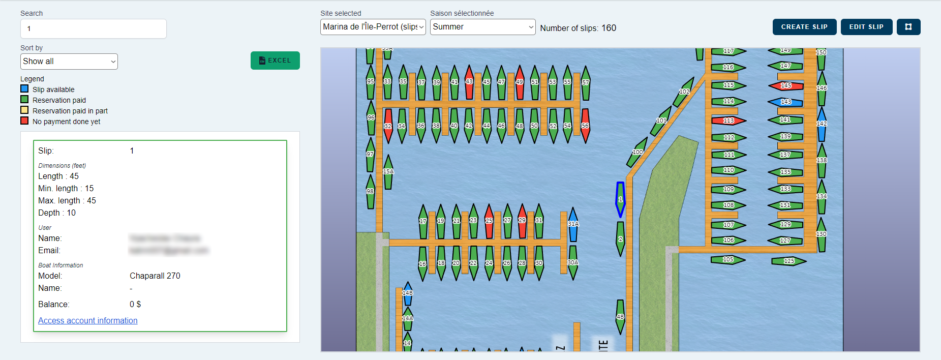 This map, paired with the slips on it, will give a convenient overview of the place. Administrator will thus be able to make a simple visual survey to find the available slips for a dock location, clients that still have payments to do, docks that are currently broken, etc. Moreover, because of its deep management nature, admins will have access to a multitude of filters to search and find a client, including their schedule and availability of their slip.