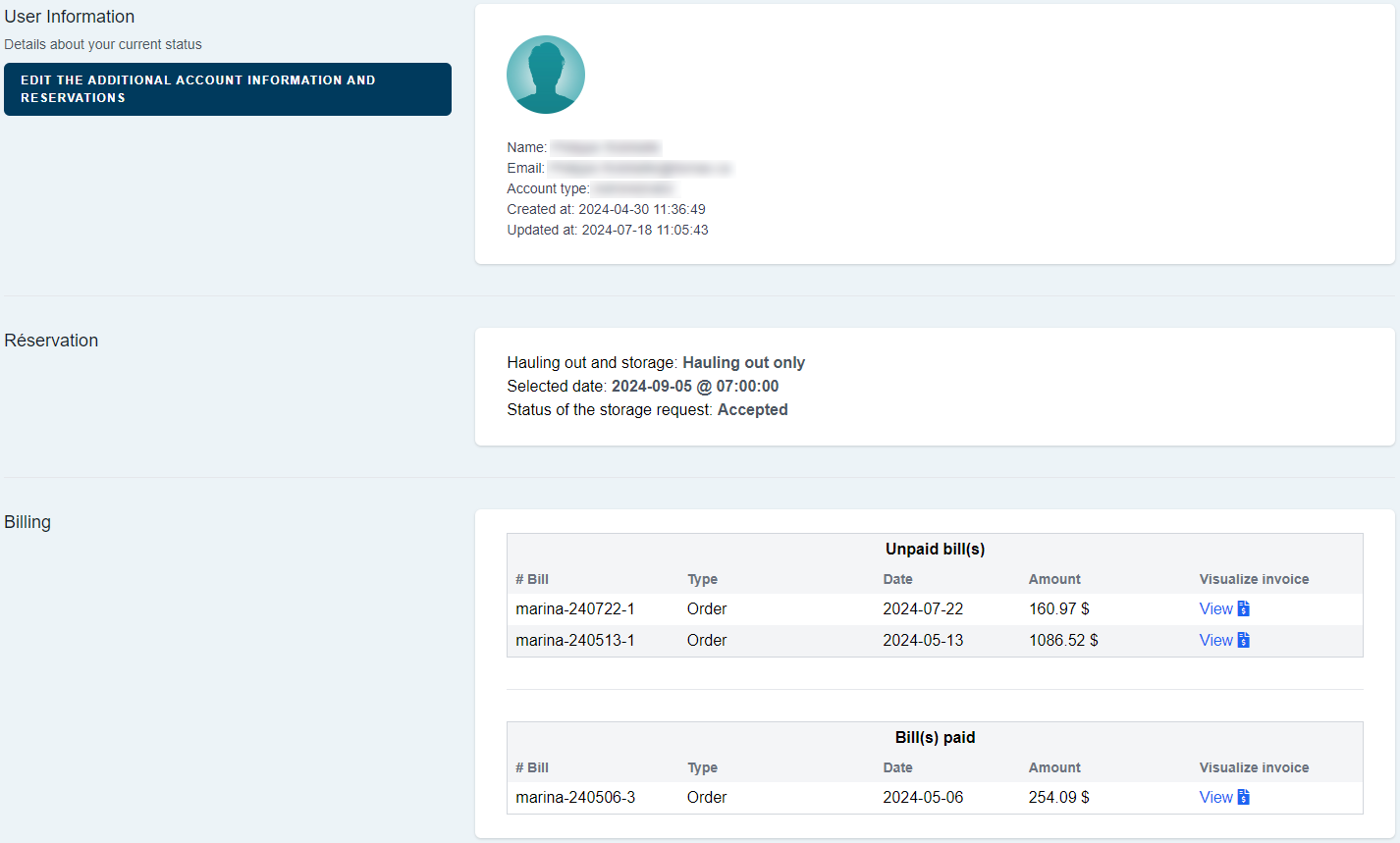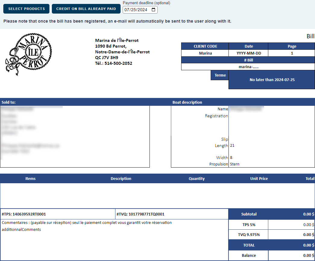 Clients will have access to their bills AND to do their payment either online, or on a sales point terminal at the marina. These transactions are protected and carried through Moneris and Global Payment. Every time a client receives a new bill, they will be immediately informed about it by e-mail.