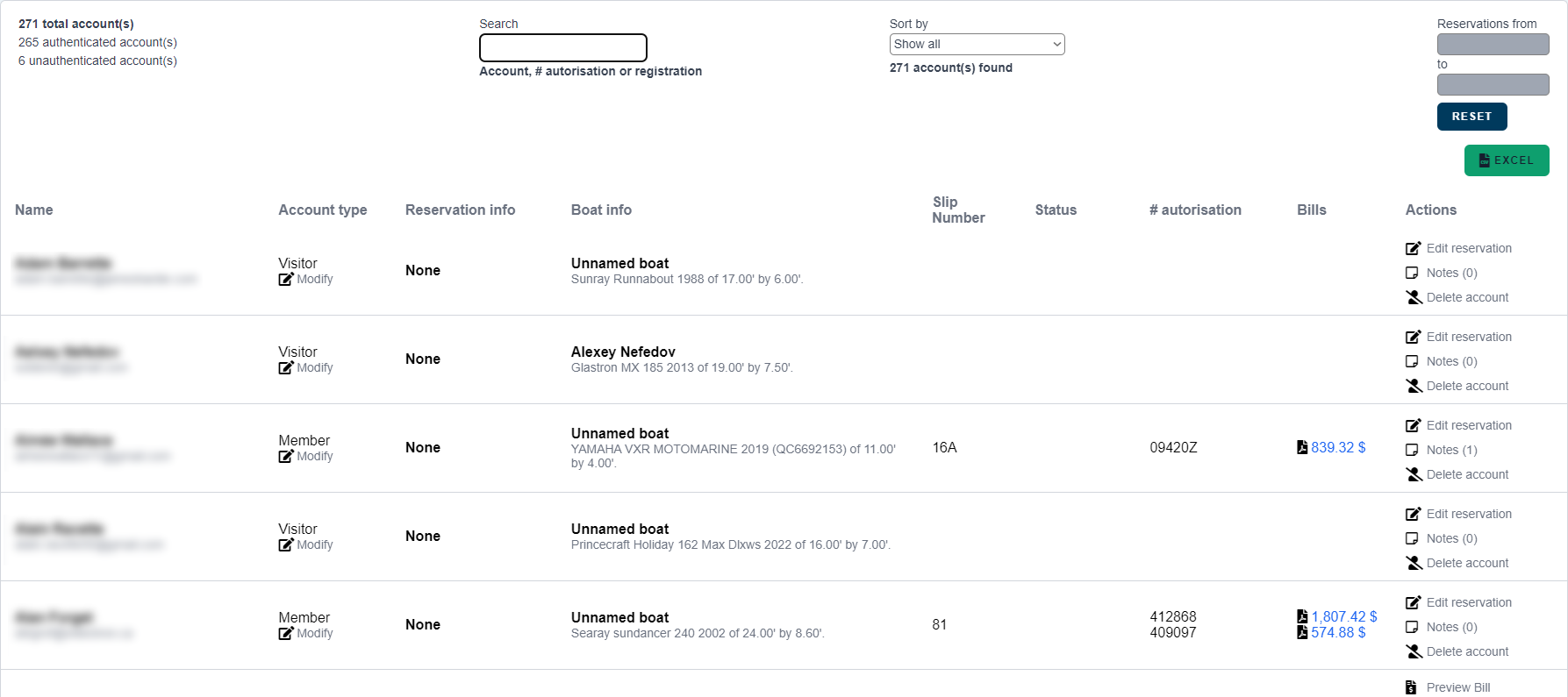 Those in charge of the marina can easily search and identify clients on their platform thanks to a table where they are all tallied up. On it, they will have access to the name of the clients, their boat information, their reservation demands, etc. Receipts will even be shown with a colour code allowing for a quick overview of those that haven’t been fully paid yet. Also, accounts that have been created but that are still waiting for the e-mail confirmation will be bolded and be shown in maroon.